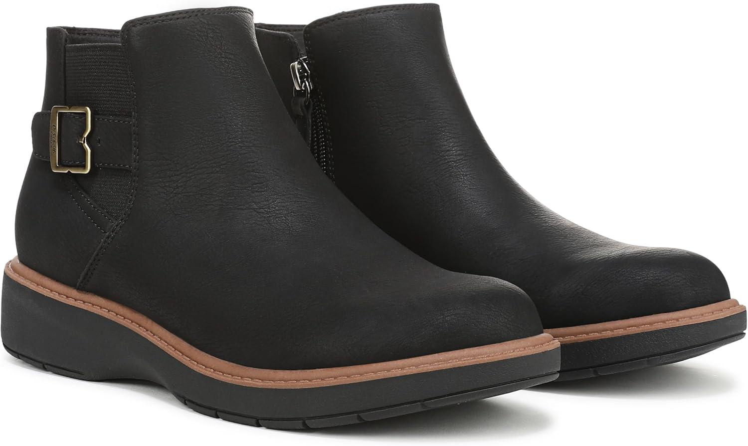 Women’s Chelsea boots with feel-good comfort and do-good design. SUSTAINABLY CRAFTED: Fabric lining partially made from recycled plastic bottles; partially recycled fabric topcloth, toe box and heel counter. MATERIALS: Low chemical faux leather upper. FIT: Outside stretch gore and inside zip for easy on/off. SUSTAINABLE COMFORT: Anti-microbial, anti-odor Insole Technology with cushioning, comfort, & support. Insoles partially crafted with 15% cushy, algae-infused BLOOM® foam. FEEL GOOD FLEX: Soft, lightweight outsole with built in flex grooves. MOVEMENT: Lightweight, flexible construction moves with you. STYLE: Ankle boots for women with stretch gore, stitching and iconic buckle details, and 1 1/2 inch grippy TPR sole. CONSCIOUSLY PACKAGED: This style is shipped in an environmentally preferred 1-piece box made with primarily recycled materials that can be recycled & soy-based inks. Keep Calm and wear Chelseas. With a durable lug sole and cool style, these will be the best Chelsea boots you’ve ever had.