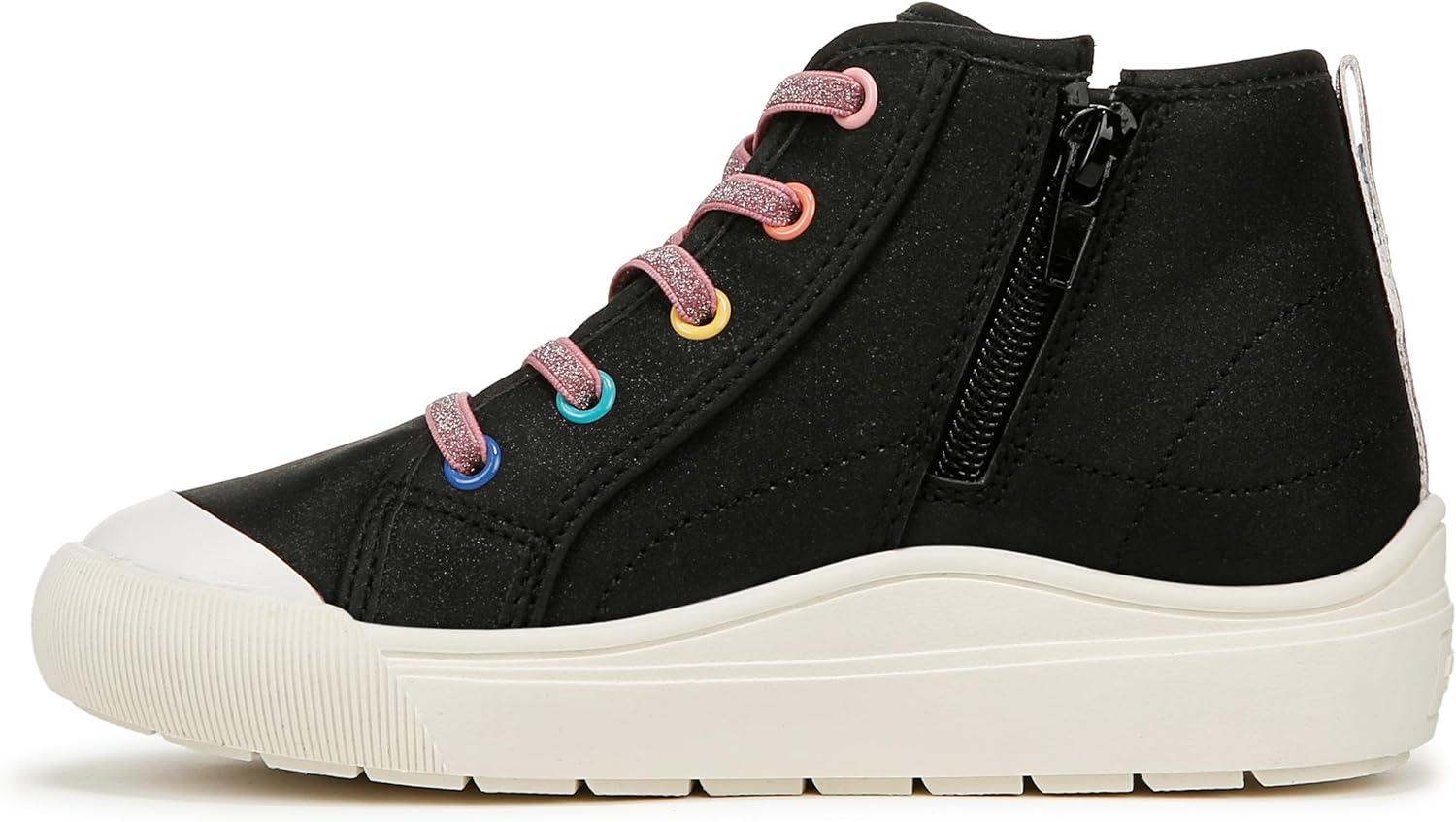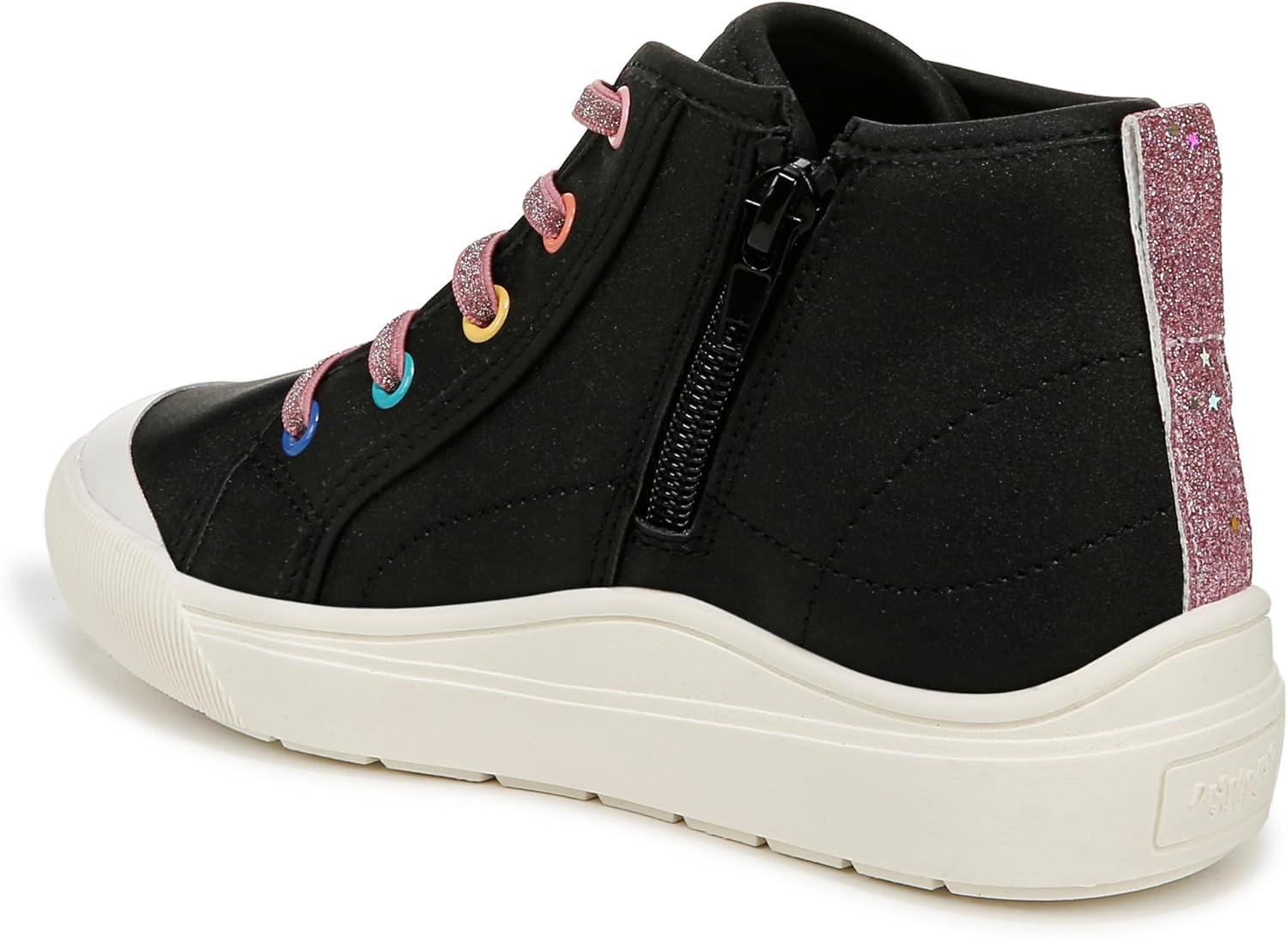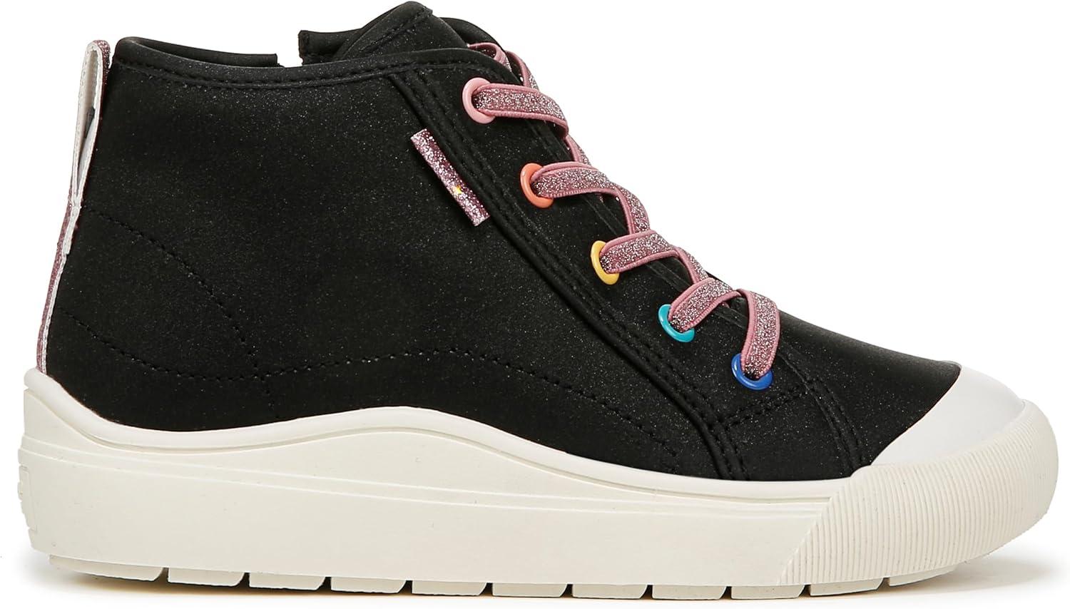 Say hi to comfort and cuteness in these must-have girls shoes. MATERIALS: Faux leather upper and fabric lining. FIT: Inside zipper for easy on/off. FEELS: Comfort Insole Technology with cushioning, comfort & arch support. MOVEMENT: Lightweight, flexible construction moves with you. FEEL-GOOD FLEX: Ultra-flexible outsoles with extra grip and cushioning. STYLE: High top tennis shoes for girls with stretchy faux lace detailing, back pull tab, and 1 inch sport sole. CONSCIOUSLY PACKAGED: This style is shipped in an environmentally preferred 1-piece box made with primarily recycled materials that can be recycled & soy-based inks. It’s giving matchy-matchy: a pint-sized version of mom’s high top sneaks with viral comfort.